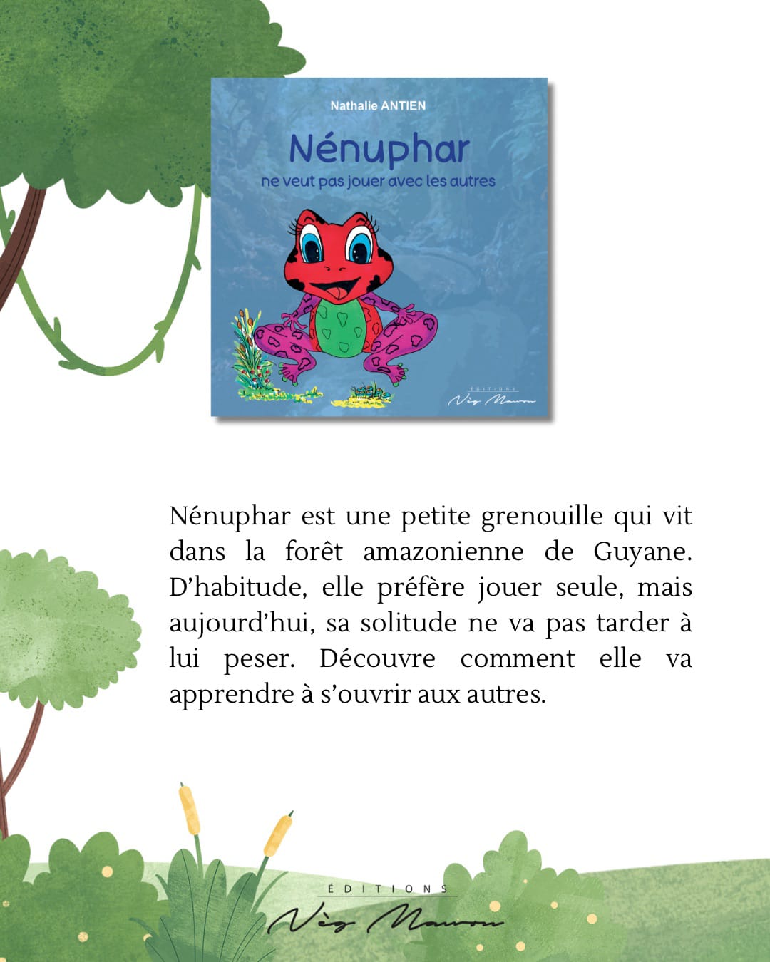Nénuphar est une petite grenouille qui vit dans la forêt amazonienne de Guyane. D’habitude, elle préfère jouer seule, mais aujourd’hui, sa solitude ne va pas tarder à lui peser.