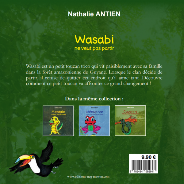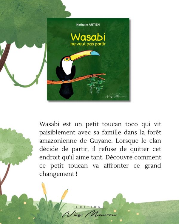 Wasabi est un petit toucan toco qui vit paisiblement avec sa famille dans la forêt amazonienne de Guyane. Lorsque le clan décide de partir, il refuse de quitter cet endroit qu’il aime tant. Découvre